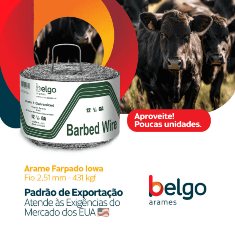 Arame Farpado Iowa 403 m – Fio 2,51 mm – 431 kgf | Padrão Exportação EUA Belgo