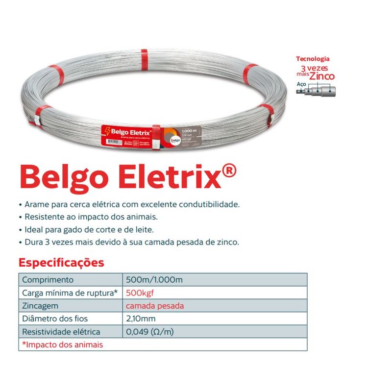 • De fácil manuseio e maior resistência à corrosão, o Arame para Cerca Elétrica Belgo Eletrix reduz custos de manutenção e implantação das cercas devido a sua alta durabilidade, além de ter um excelente custo benefício.