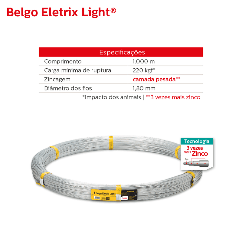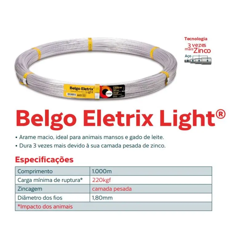 O Arame para Cerca Elétrica Belgo Eletrix light®, é um arame macio, de alta durabilidade e elasticidade. Proporciona uma cerca resistente ao impacto dos animais e possibilita uma boa condutibilidade na cerca.