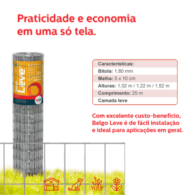 Tela Soldada Belgo Leve 10x5 Fio 1,80mm 1,02m x 25m é uma tela fabricada com arames de aço, galvanizados e eletrosoldadas. Com sua leveza, tem uma versatilidade de aplicações e um excelente custo-benefício, podendo ser aplicada em jardins, hortas, contenção de pequenos animais e para delimitar o acesso de pessoas a determinado espaço, ou em requadros metálicos para fechamento de vãos e cercamentos em geral.